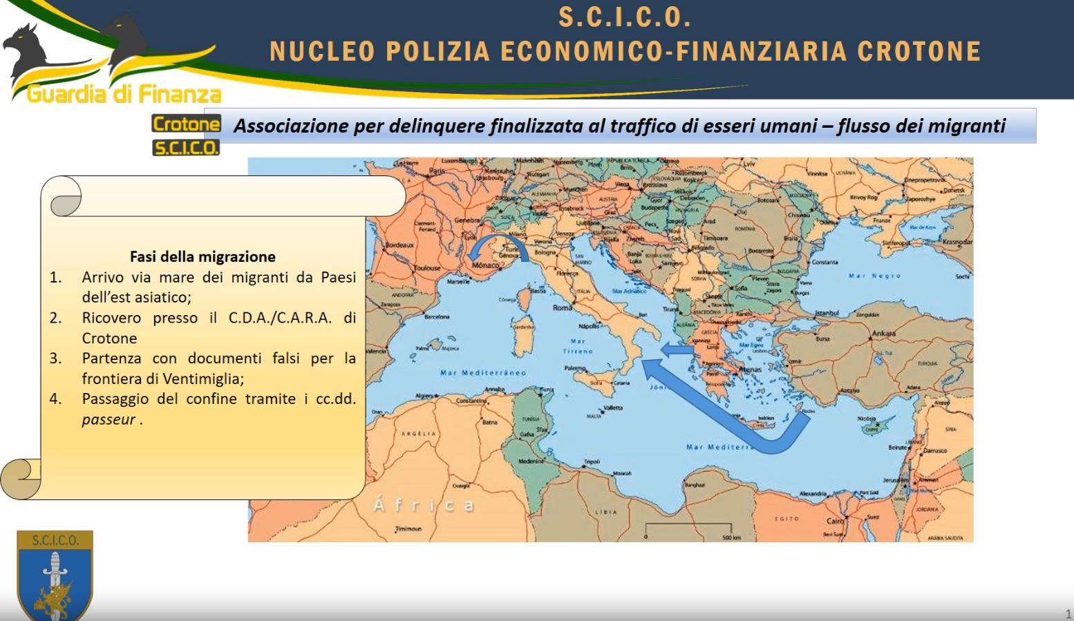 Per soddisfare i desideri dei migranti, ossia recarsi verso il Nord Europa, l’organizzazione si avvaleva di una rete di connazionali che si occupava della loro sistemazione alloggiativa nel territorio crotonese e dell’acquisto di biglietti di viaggio su linee ferroviarie o bus per i successivi spostamenti verso il confine nazionale. Una volta giunti al confine, l’organizzazione poteva disporre dei cosiddetti ‘passeurs‘ che effettuando la spola, attraverso la frontiera di Ventimiglia, tra l’Italia e la Francia agevolavano l’espatrio irregolare.