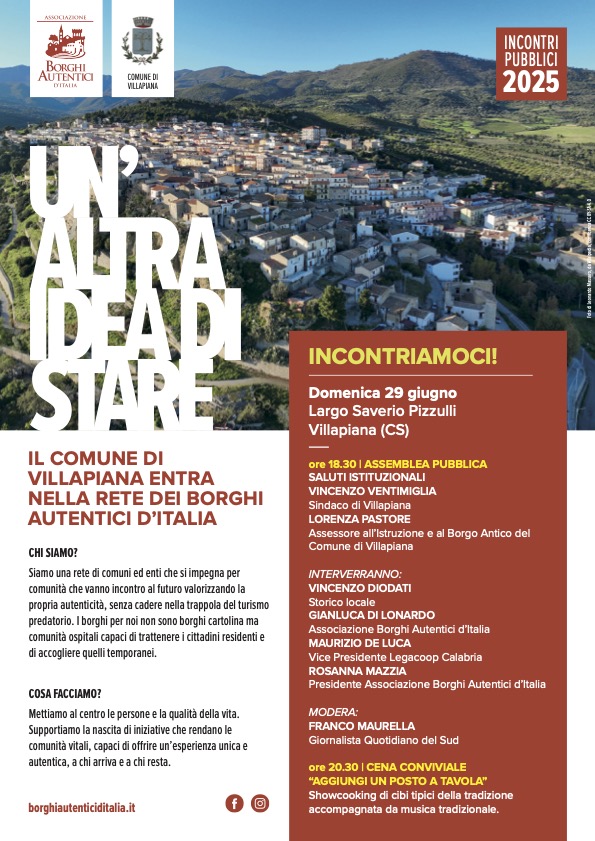 La serata proseguirà con “Aggiungi un posto a tavola”, una cena conviviale tra i vicoli del borgo con stand enogastronomici dedicati ai sapori della tradizione locale, accompagnati dalla musica popolare dei Tira Taranta. Un’occasione unica per festeggiare insieme l’ingresso di Villapiana nella grande famiglia dei Borghi Autentici d’Italia e per riscoprire, nel segno dell’identità e dell’accoglienza, l’anima più vera del territorio.